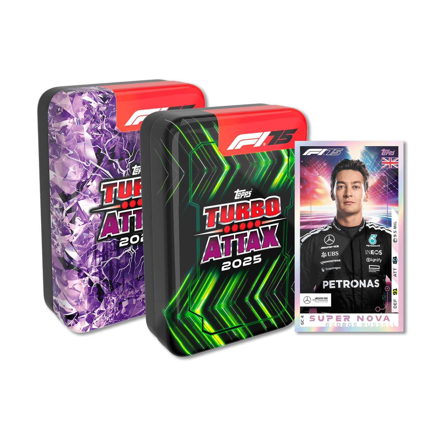 Turbo Attax 2025 F1 trading card collection featuring vibrant collectible tins and a Super Nova card.