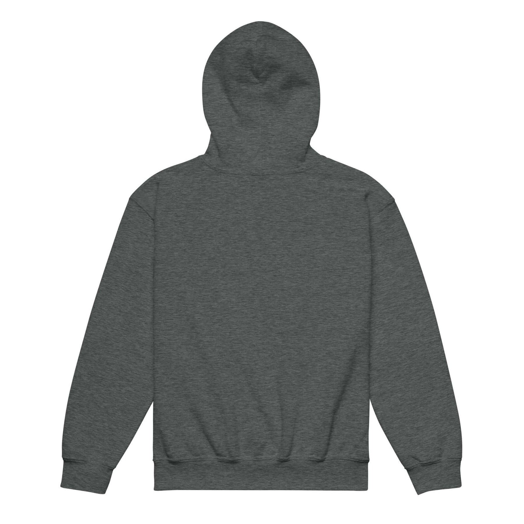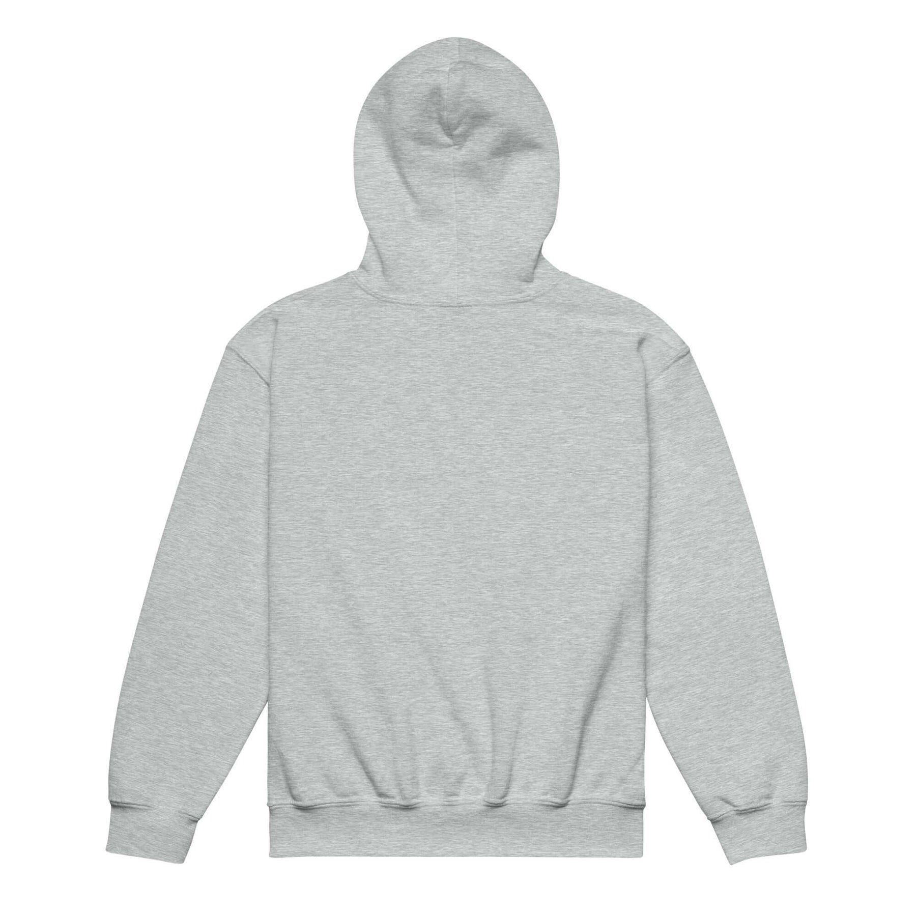 Back view of youth heavy blend hoodie in grey, designed for comfort and durability for active children.