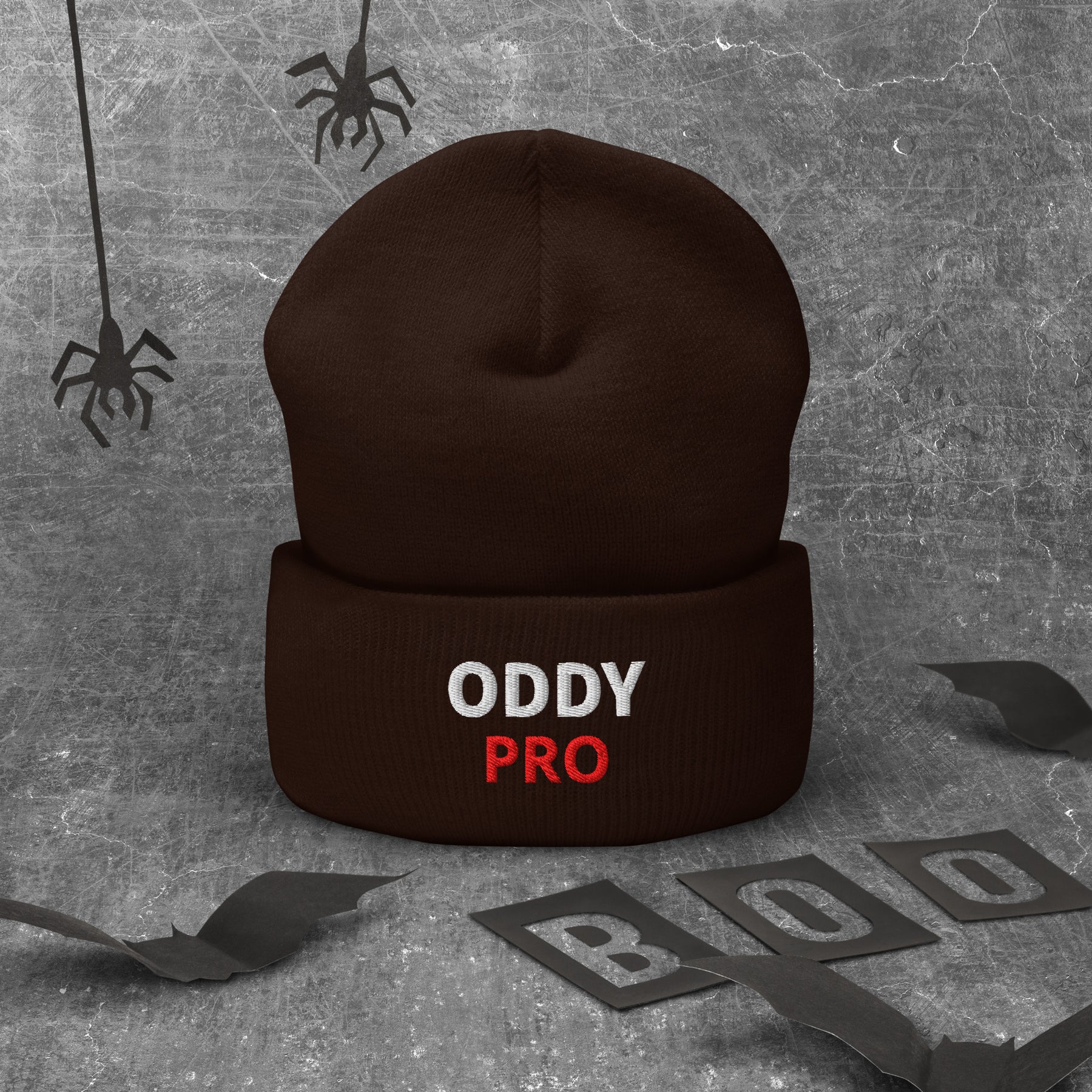 Oddy Pro Cuffed Beanie in brown with bold text, lying on a textured background with Halloween decorations.