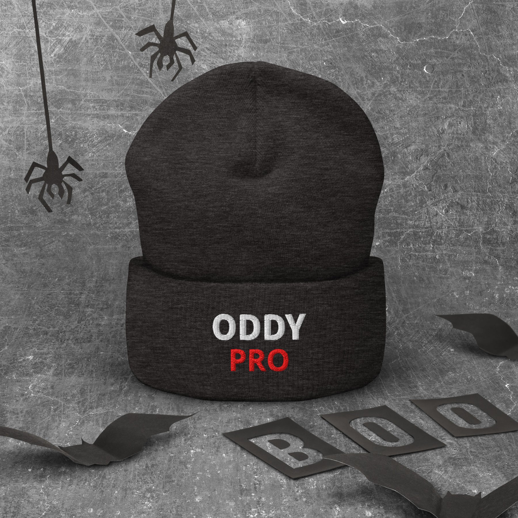 Oddy Pro Cuffed Beanie displayed on a textured background with Halloween decorations.